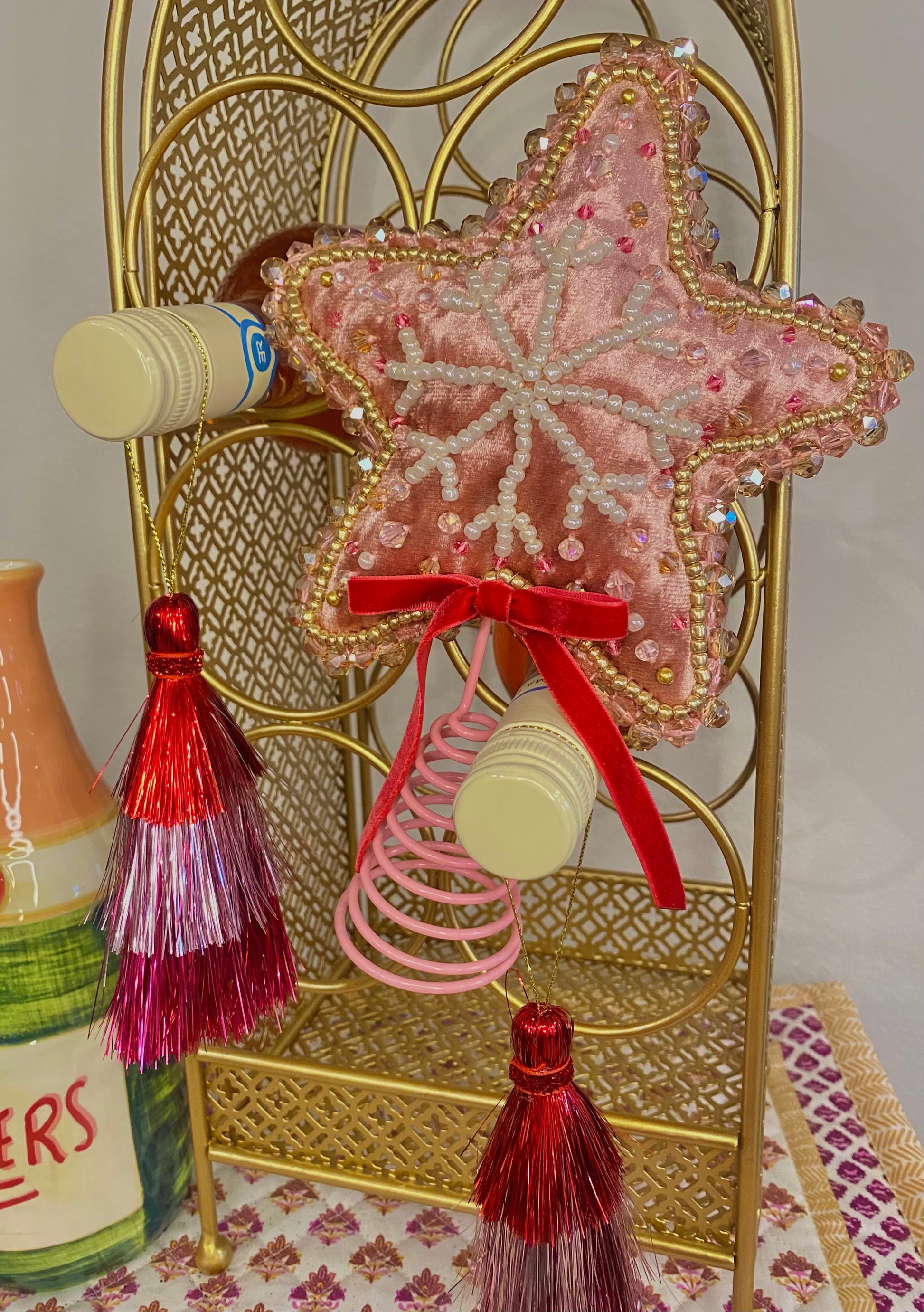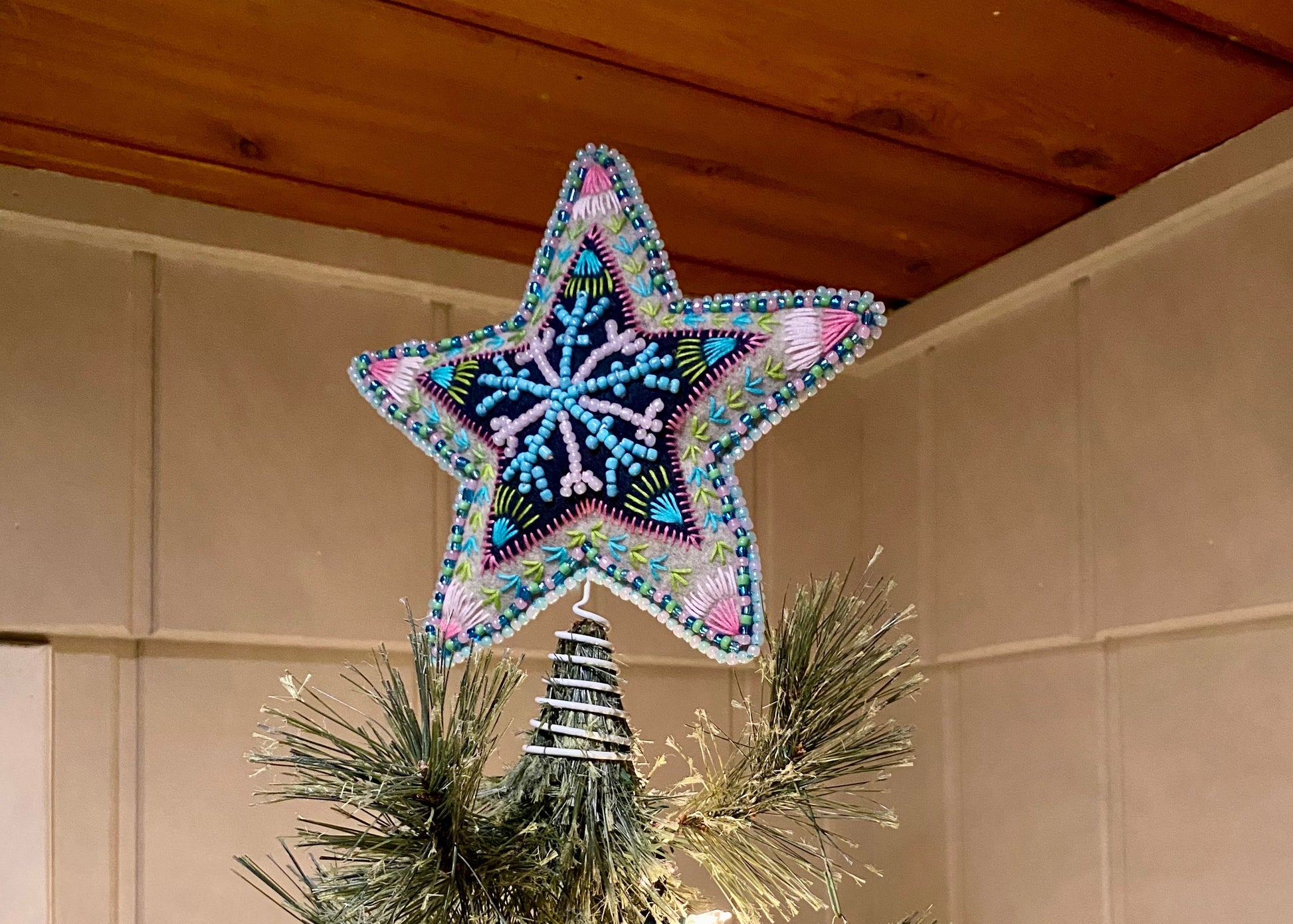 Add a sparkling touch to your holiday decor with this beautiful, hand-stitched felt tree topper. Adorned with delicate beads, it brings a charming, handcrafted sparkle to the very top of your tree, making your festive celebrations shine bright!